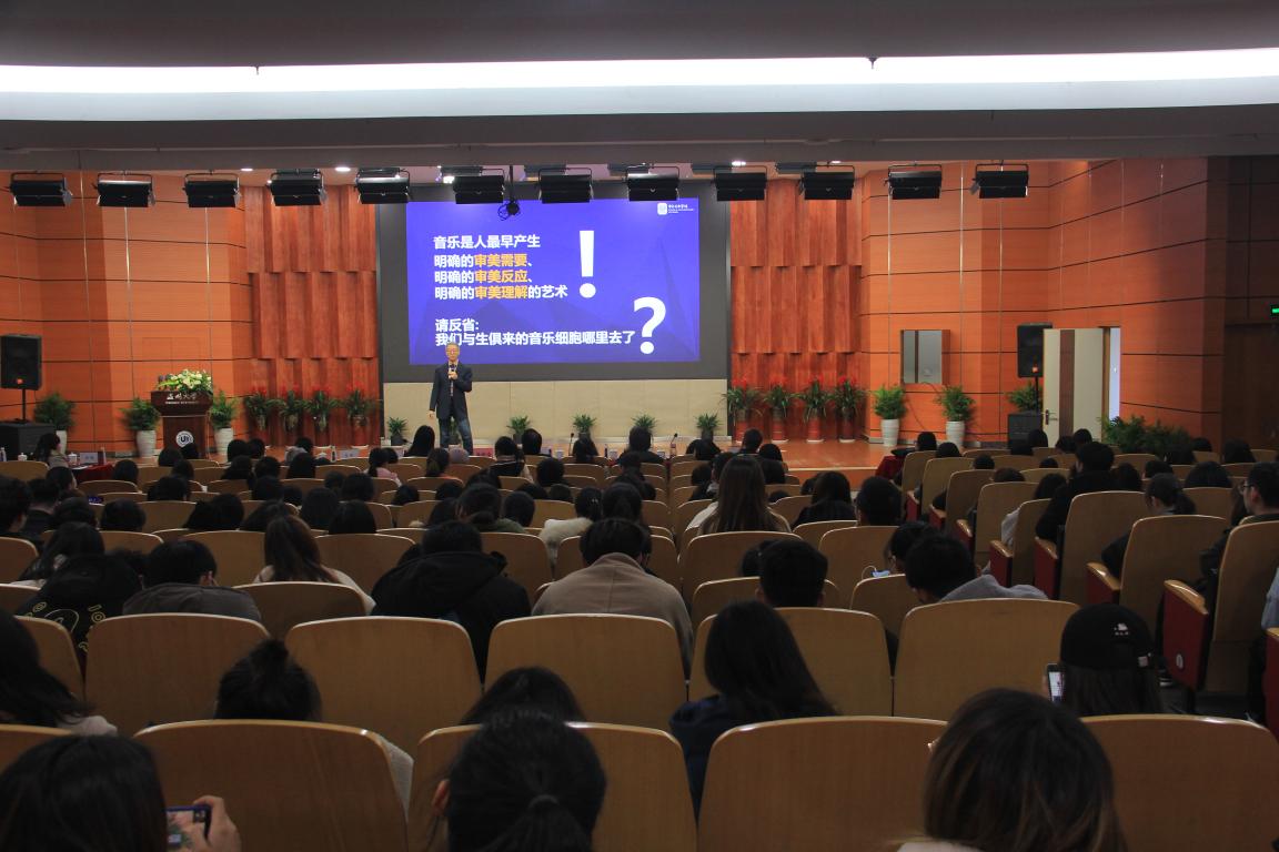 在轻松活跃的气氛下周海宏教授开始了他的讲座,他先总体的提出了今天要解决的三个问题:音乐怎么听,艺术有啥用,审美怎么教和今天要达到的三个目的:掌握音乐的美学原理,揭示艺术的本质功能,认识教育的基本原则。首先,周海宏教授让在座的体会了许多音乐片段,从而引出了他所要讲的三个原理。第一,音乐是听觉得艺术,情绪的艺术。第二,音乐的理解是高度主观,多解的,模糊的,不确定的。第三联觉是音乐与其表现对象之间的中间环节。他强调着“音乐何需懂”。每个人天然的在音乐世界里, 音乐教育只需要本能。其次,周海宏教授提出音乐教育与幸福有关,心中需要音乐,无论外部如何污浊,都能保持内心的纯净,音乐是情绪管理,精神减压的最佳手段,感性素质低的人幸福少。音乐教育与事业成功有关,在需要感性智慧的领域国人的竞争力明显不足,我们急需提升感性素质。音乐教育还与感性文明有关,感性素质的培养要通过艺术教育来实现,他说:“要想成功幸福,从小热爱艺术!为什么要这样说呢?因为人有两大心智能力:一个是理性,一个是感性。对应的,理性,是科学素质的核心,感性,是审美素质的核心。理性思维的代表领域是科学,科学征服了世界;感性思维的代表领域是艺术,艺术美化了世界!理性素质给我们认识世界、征服世界的力量;感性素质是我们体验幸福人生、创造美好生活的前提。”最后周海宏教授揭示了许多当下音乐教育的问题,对于教师,他提出莫把严厉当严格,要爱孩子。对于家长,他提出要给予孩子更多的爱,鼓励与陪伴,快乐教育是通往成功的动力保障。在讲座的最后,周海宏教师呼吁“让教育成为人生幸福的组成部分”,希望每个人都能在幸福中走向成功。