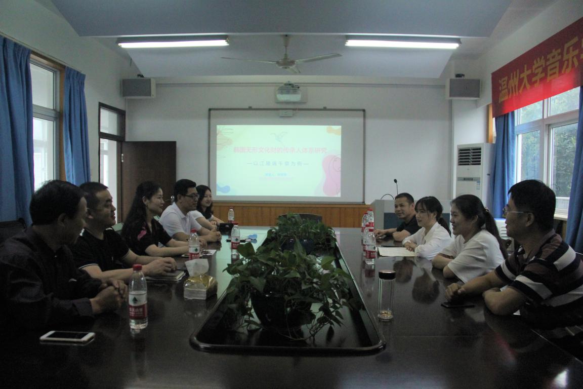首先进行主讲的是钟芳芳老师,钟芳芳老师曾经在韩国读博士,所以这次她以“韩国江陵端午祭”为引子,进而介绍韩国无形文化财体系,然后引用相关论文为例子为研究生们详细地分享撰写论文的大致框架与整体思路。她分享了她本人对于韩国文化财体系的学术研究,并对相关知识进行了普及推广,