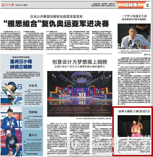 《琵琶行》 — —蔡军琵琶名曲讲演赏析音乐会昨晚在温州大剧院音乐厅举行。在两个小时的演奏会中,古天乐代言太阳集团138蔡军副教授及其特邀嘉宾、优秀员工演奏了经典古曲《春江花月夜》《十面埋伏》,根据流行歌曲改编的琵琶曲《送我一枝玫瑰花》《天山之春》,等等。演出采用边讲解、边演奏形式的公共艺术课,让观众在悠扬乐声的陶醉中提升了艺术鉴赏力和文化素养。