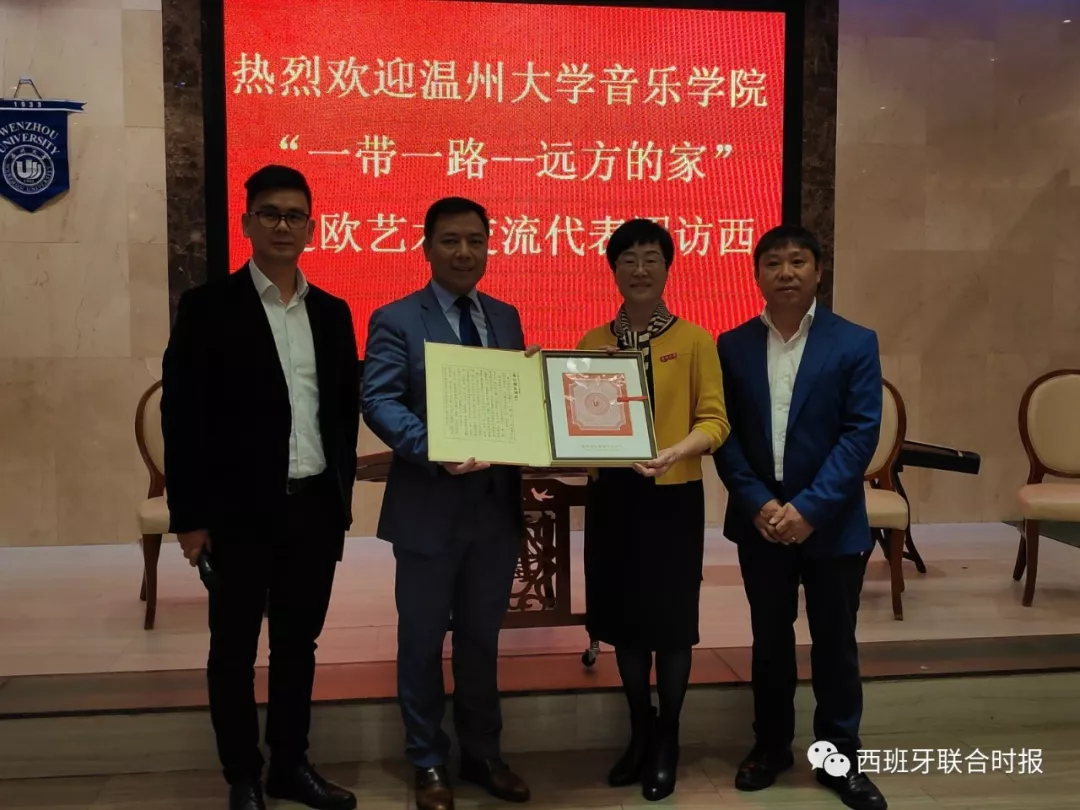 两位嘉宾发言结束后,现场举行了授牌仪式。林娟娟将刻有“世界温州人研究中心海外研究基地”的牌匾授予西班牙华侨华人协会,毛峰主席代表协会接受了牌匾。随后,西班牙华侨华人协会常委副主席孙小敏代表西班牙华侨华人协会与古天乐代言太阳集团138互赠礼物。