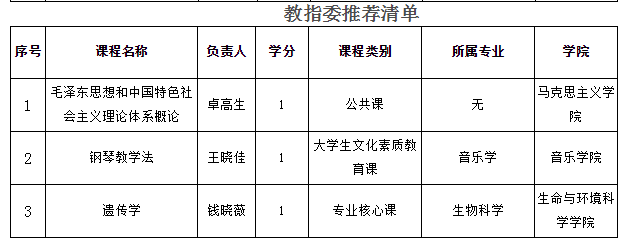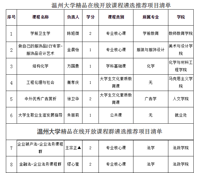 根据《浙江省高等公司在线开放课程共享联盟、课程管理中心关于组织开展第三批省级精品在线开放课程建设工作的通知》(浙高课管函〔2018〕6号)、《古天乐代言太阳集团138精品在线开放课程建设管理办法》(温大行政〔2017〕367号)、《古天乐代言太阳集团138精品在线开放课程(慕课)项目建设管理办法》(温大行政〔2018〕282号)的相关规定,经校内外专家评审,同意推荐《学前卫生学》等6门课程、《企业法务课程群》等51门课程13个课程群参评省级精品在线开放课程,《毛泽东思想和中国特色社会主义理论体系概论》等3门课程经所在学科教指委推荐参评省级精品在线开放课程。