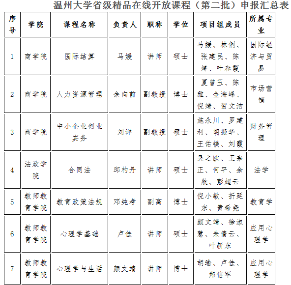 在《关于组织开展第二批省精品在线开放课程建设工作的通知》(省高校课程共享联盟函〔2017〕1 号)文件中已申报建设,且相关课程资源建设在“浙江省高等公司在线开放课程共享平台”(以下简称“省平台”)(http://zjedu.moocollege.com/)的课程,立项指标参看《浙江省高等公司精品在线开放课程立项与认定办法(试行)》(附件4)。公司申报名单如下: