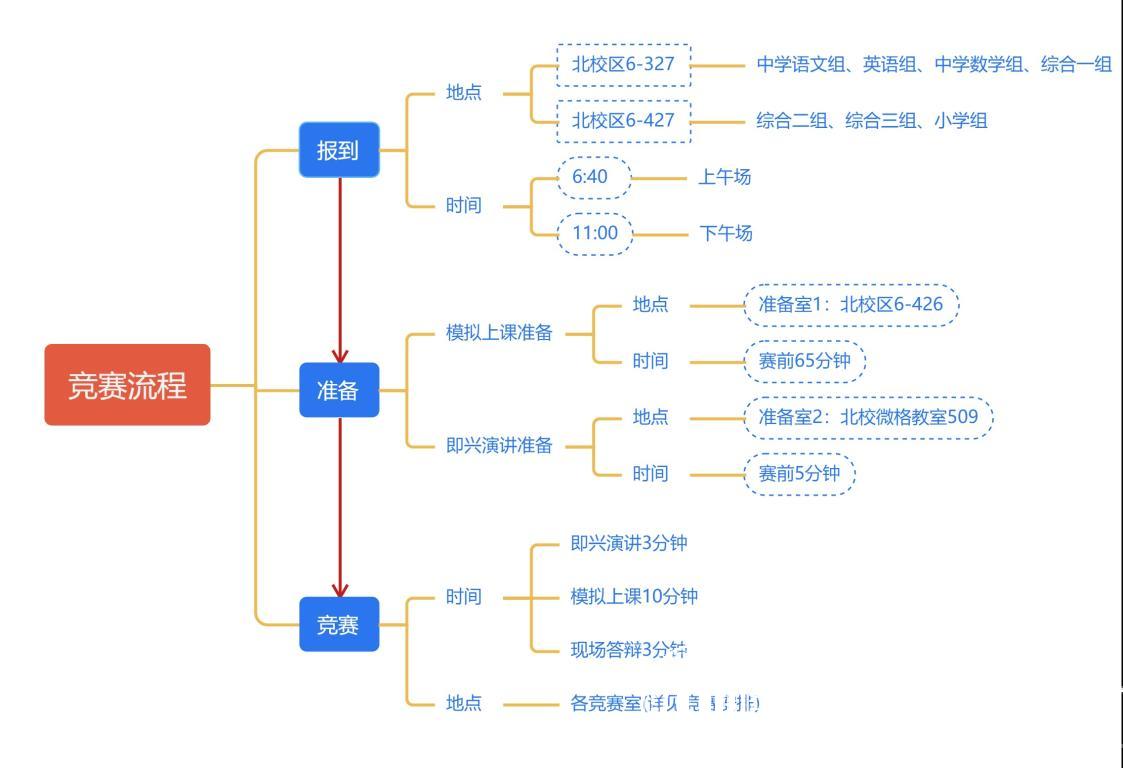 2.赛前准备:每位选手赛前准备时间共计65分钟,其中模拟上课准备时间为60分钟(选手自行决定是否需要制作课件),即兴讲演准备时间为5分钟。