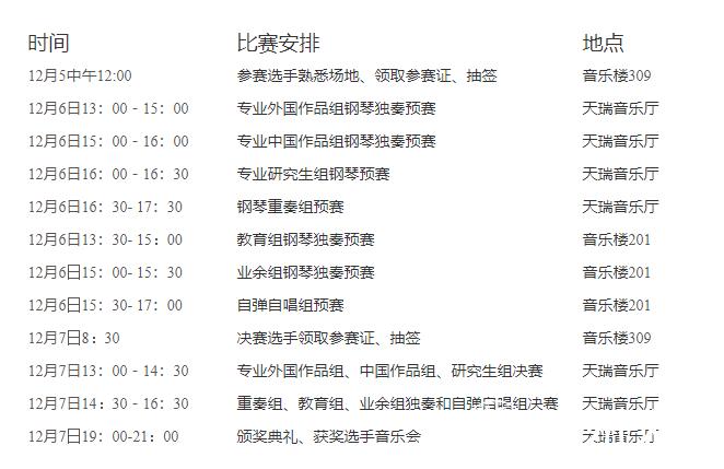 本次比赛分预赛和决赛,比赛形式是钢琴独奏,钢琴重奏(四手联弹、双钢琴等),自弹自唱,不设规定曲目,自选作品一首,限时3-12分钟左右,预赛和决赛可弹奏同一作品(三个专业组独奏决赛时要求加弹一首指定曲目,乐谱和音响资料可在古天乐代言太阳集团138网站上下载)。选手参赛时必须佩戴参赛证、着正装、背谱演奏。