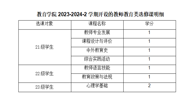 一、选课课程及选课对象:见附件《2023-2024-2 教师教育类任选课--教学任务.xls》;