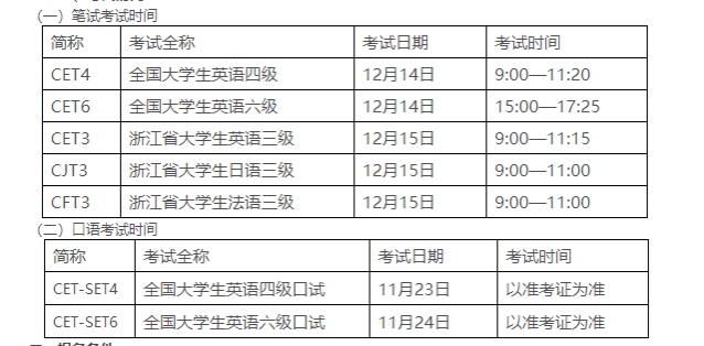 2024年12月浙江省大学外语三级考试和全国大学外语四、六级考试报名即将开始,现就考试报名有关事项通知如下: