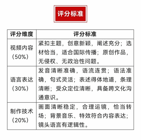 往年的作品评分标准如下。如有更新,以公众号“外研社国才杯外语能力大赛”的官方通知为准。
