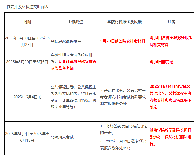 1.2025年5月20日至2025年5月23日16:30前,各公司填写马院期末考试安排总表和公司员工具体考试时间地点安排表(《马克思主义基本原理概论》、《毛泽东思想与中国特色社会主义理论体系概论》、《习近平新时代中国特色社会主义思想概论》、《思想道德与法治》、《中国近现代史纲要》(拟定于第16周至17周周三期间考试),考前教务处统筹调整后发布信息。