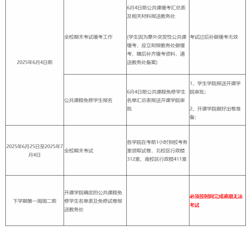 3.期末考试的公共课程缓考申请汇总材料最迟请于2025年6月4日前送至南校区行政楼411办公室。专业课程考试缓考由开课公司在该门课程开考前自行录入系统。