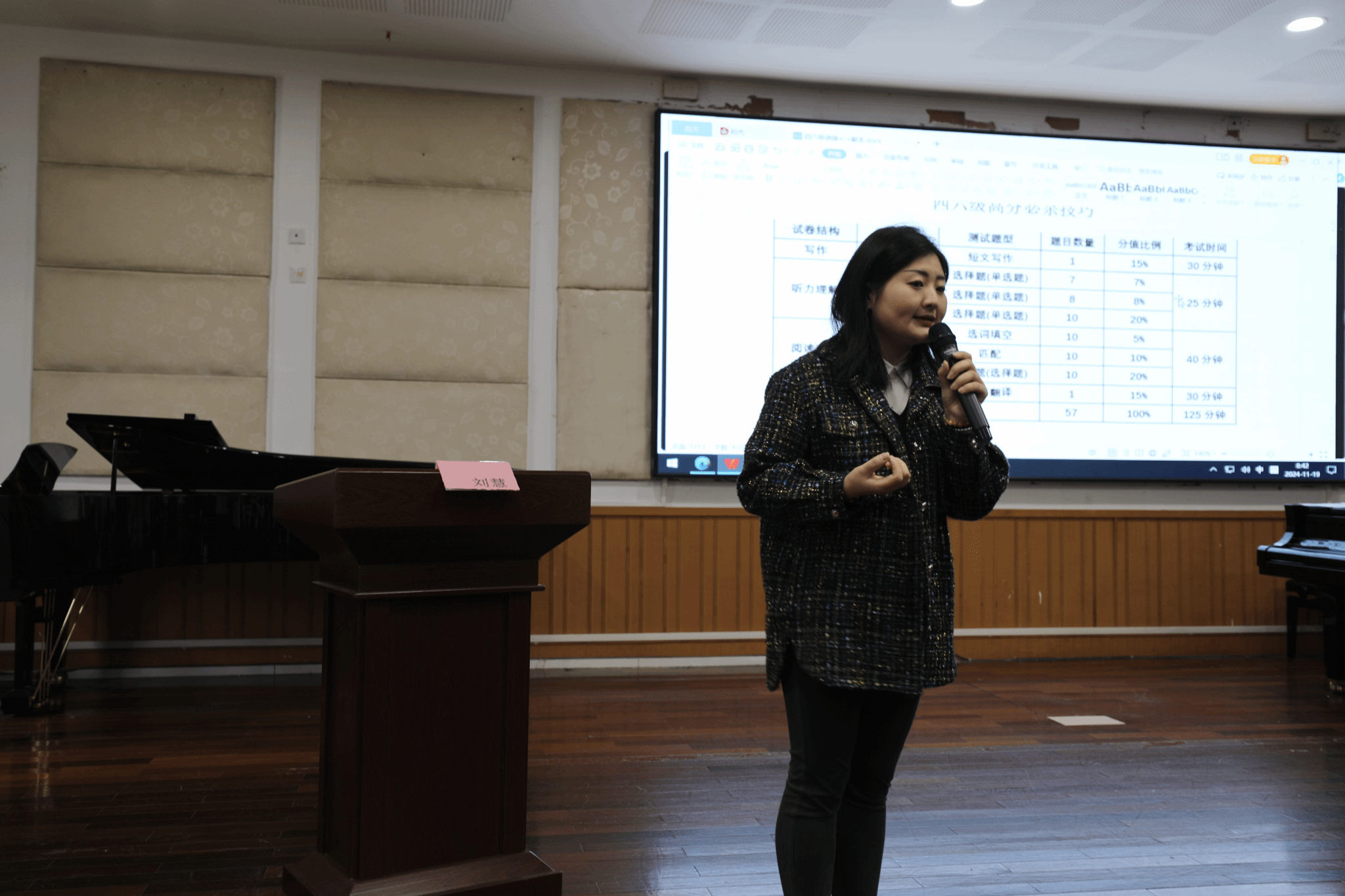 讲座伊始,刘慧老师首先介绍了四六级考试的基本情况和考试要求,让同学们对考试有了更加全面的了解。随后,她结合多年的教学经验,从听力、阅读、写作和翻译四个方面进行了适当的讲解和示范。