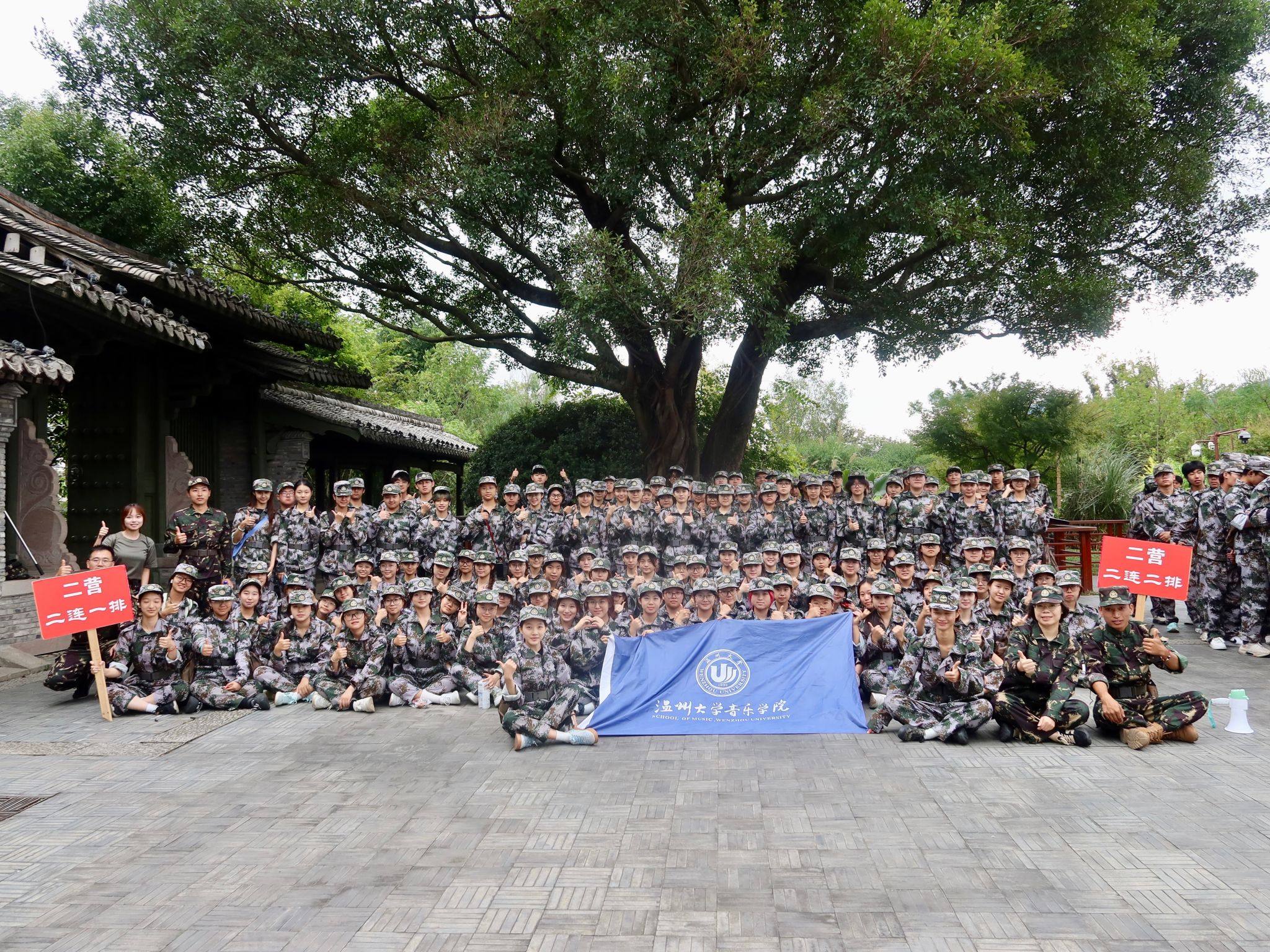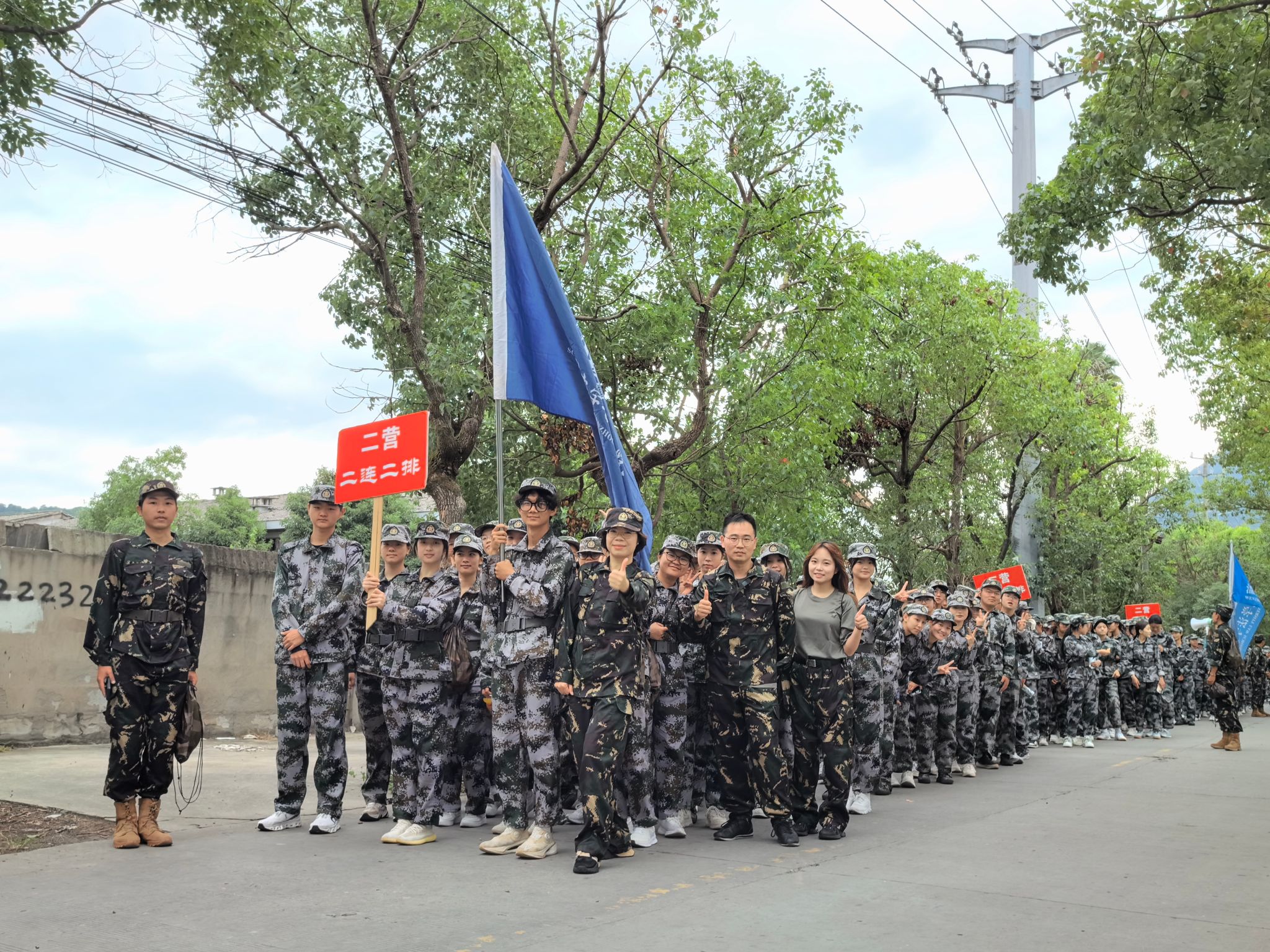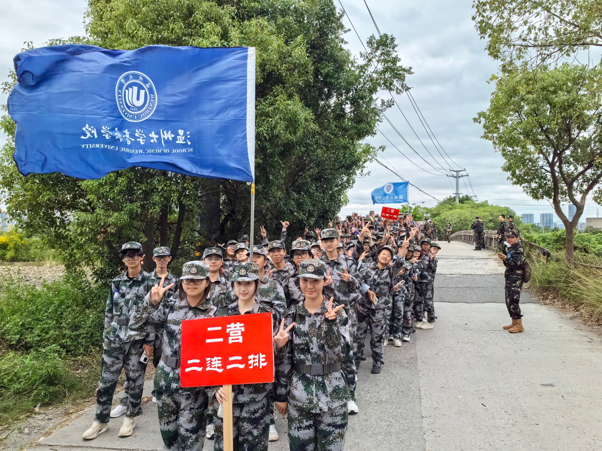 长达四个小时的行军,是对意志的极致打磨。队伍以排为单位,宛如流动的音符,沿着精心规划的路线谱写出壮丽的进行曲。从北校区操场出发,穿行于景观大道的如画风景中,路过三垟湿地的潋滟水光,在大榕树广场的浓荫下留下铿锵足迹,再折返大学城校区。翻倍的里程,是公司送给新生的第一份“硬核”成人礼。